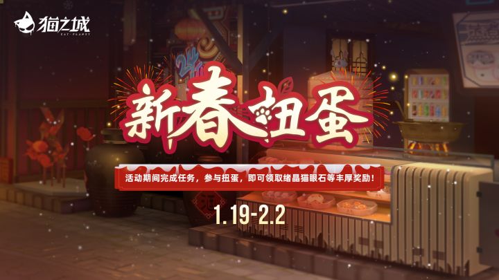 「新春扭蛋」即将开启活动时间:1月19日-2月2日活动期间完成任务,参与扭蛋,即可领取绪晶猫眼石等丰厚奖励!——————————————☆欢迎调查官入驻《猫之城》!猫咪即正义,情绪即力量!【猫之城】官方资讯平台:①官网:②官方微博:③官方微信公众号:搜索“猫之城”④官方B站:【猫之城】官方粉丝交流群:10群:11群:12群:13群: