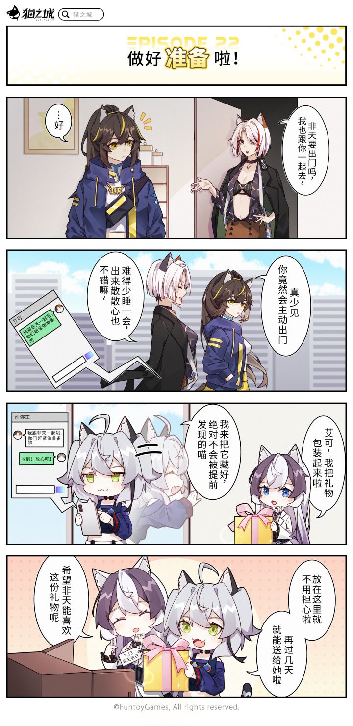 「第二十二话丨做好准备啦!」非天和南弥生在回来的路上了?快快,把东西藏好不要被发现了!——————————————☆《猫之城》全平台预约已开启,前往官网预约()即可获得专属预约成就奖励!【猫之城】官方资讯平台:①官方微博:②官方微信公众号:搜索“猫之城”③官方B站:【猫之城】官方粉丝交流群:1群:(已满)2群:(已满)3群:(已满)4群:(>ω・* )ノ期待与您在新