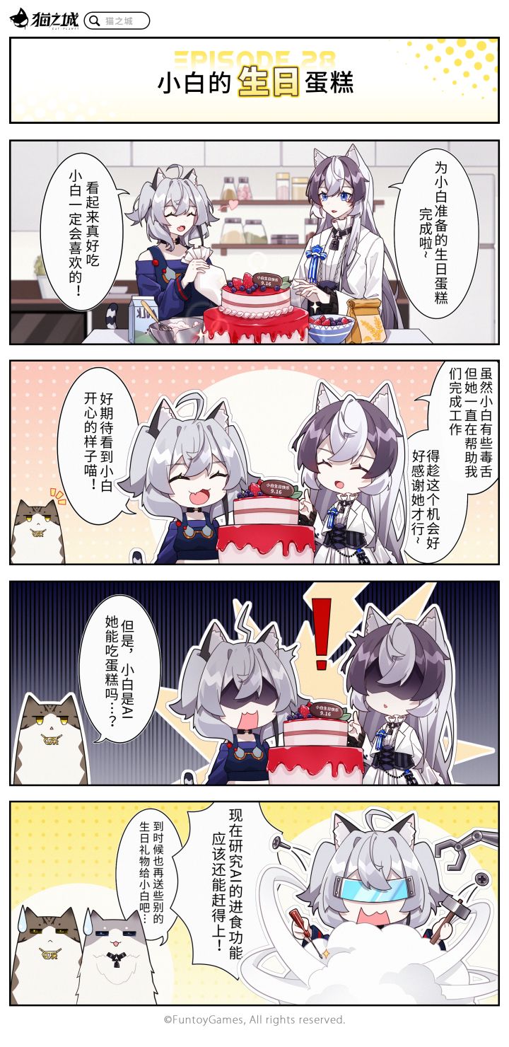 「第二十八话丨小白的生日蛋糕」为小白准备了蛋糕…但首先得想个办法让她能吃东西才行!——————————————☆《猫之城》全平台预约已开启,前往官网预约()即可获得专属预约成就奖励!【猫之城】官方资讯平台:①官方微博:②官方微信公众号:搜索“猫之城”③官方B站:【猫之城】官方粉丝交流群:1群:2群:3群:4群:(>ω・* )ノ期待与您在新海市中相遇哟~