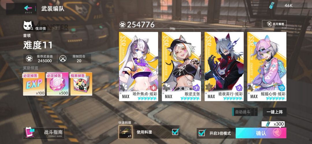 Boss分裂后优先解决右边那个(不然后面几回合很难打),长夜全程不开大(反正敌怪也放不出SP技能)残血时套一个盾(搭配着焦点的回血使用)。利用企鹅三星a技能减SP让对面全程放不出大招。多试几次即可,后续可能会放一些视频讲解。