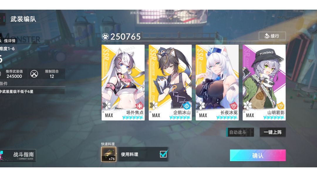 武装选择的是场外焦点、山明箬影、企鹅冰山,以及新出的武装长夜冰冕 武装强度要求:除了焦点四觉,山明二觉以外,其他都可零觉(零觉冰冕保c能力要高于四觉,这边是测试服所以手贱点了四觉)。企鹅攻击3w左右,暴击70左右,爆伤220左右,我用的是破碎重装,由于关卡机制没有特别适配的涂鸦,所以可以散套,达到数值就可以。其他一律堆生命,焦点和冰冕35w+;山明涂鸦四号位堆护盾增幅,生命30w+;涂鸦方面冰冕带专业防护(全程不开大招,大招会占卡槽);焦点和山明带黄金补给。 说一下通关要点 1.开局两个兔子自带一点SP,企鹅两个A技能分别打一次加一个B技能,再搭配开局回一点SP的料理能做到第二回合放大。 2.一定要注意保留一只兔子,不然BOSS原本一回合一次的行动会变成三次,导致两回合一个大招很难顶,兔子的伤害并不高所以不要着急杀。 3.灵活运用四觉焦点的技能加星效果,除焦点和企鹅以外的三星卡不要随便放,看到有焦点A技能的时候才扔 4.第二回合用企鹅的大招干掉一只兔子,减少A技能的消耗量。 5.攒企鹅、冰冕、山明的二星卡,在第四回合保证有山明大,将这些二星卡升三星在后面用来升焦点的A技能 6.第一轮爆发是第五回合,也就是BOSS开大后,焦点开大+两个或三个企鹅三星A,如果只有两个就再补一张治疗卡保生存,一般能打到50%~60%的血量 7.接下来的回合就等焦点的A技能,出来后扔两个三星卡将A技能升到三星,换企鹅的A技能。 8.爆发过后,企鹅的技能不要一次扔完,一回合扔一次能吃到共鸣的加伤。 9.山明、焦点全程只开一次大,由于开一次大招BOSS会回40%左右的血,所以后面就只管保c换牌,由企鹅自己打完剩下的血量。 10.关卡机制的放大敌人回血的判定是先受伤后回血,所以如果大招能一击必杀,就能吞掉治疗量,我这个练度的企鹅斩杀线对BOSS而言是10%~15%左右。 11.注意留着的小怪的血量,别BOSS干掉了小怪还留着。 12.企鹅的练度要求比较苛刻,阵容偏平民向,所以如果练度达不到要求就会因为伤害过低吃满回合。 13.长夜可用小白代替,也是带专业防护,保c能力平起平坐。 14.推荐带爆燃或铁臂,由于测试服没养猫所以只能用续行。 15.料理一定要吃,很关键的。