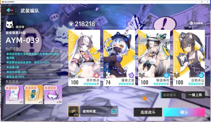 涂鸦略差,所以把暴击率道具点满了,一般情况2MAX道具应该够用38层阵容如下,企鹅猪突其余黄金多凹黄金触发,留点企鹅卡到第五回合。第四回合的时候场外sp发现企鹅金B+小音sp+企鹅sp和金B第五回合饮料sp+企鹅sp+其他输出卡40层阵容如下,没啥难度,瑶瑶在boss要放眩晕技能时挑衅,要封锁时嘲讽或者挑衅就可以了。输出正常来。