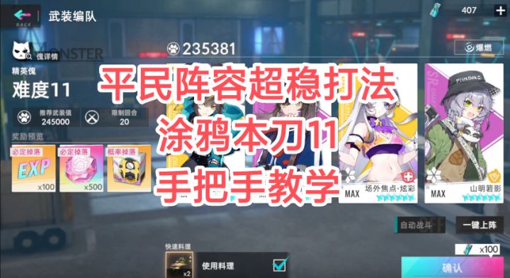 一.阵容场外焦点 自由轮滑 细雨萌萌 山明二.练度要求场外焦点 自由轮滑无需觉醒 最好max 山明最好四觉 100即可 细雨100即可三.上下位替代叛逆主张和SR不良少女是自由轮滑的上位,自由轮滑输出比他们两都低没有山明的话就不要上细雨萌萌了,换成2觉防爆者加炮手,第四回合打防爆者大招+炮手大招硬吃boss大招,第五回合输出,其他和视频差不多。四.涂鸦自由轮滑最好乘胜追击,猪也是可