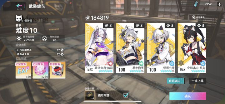 稳定率接近百分之百,炮手毒女唯一指定亲妈,开局进入一定要带加sp的药,让炮手在瑶瑶死前开出来大,这是最关键的点,阵容面板如图。