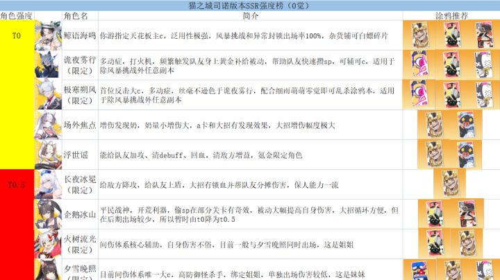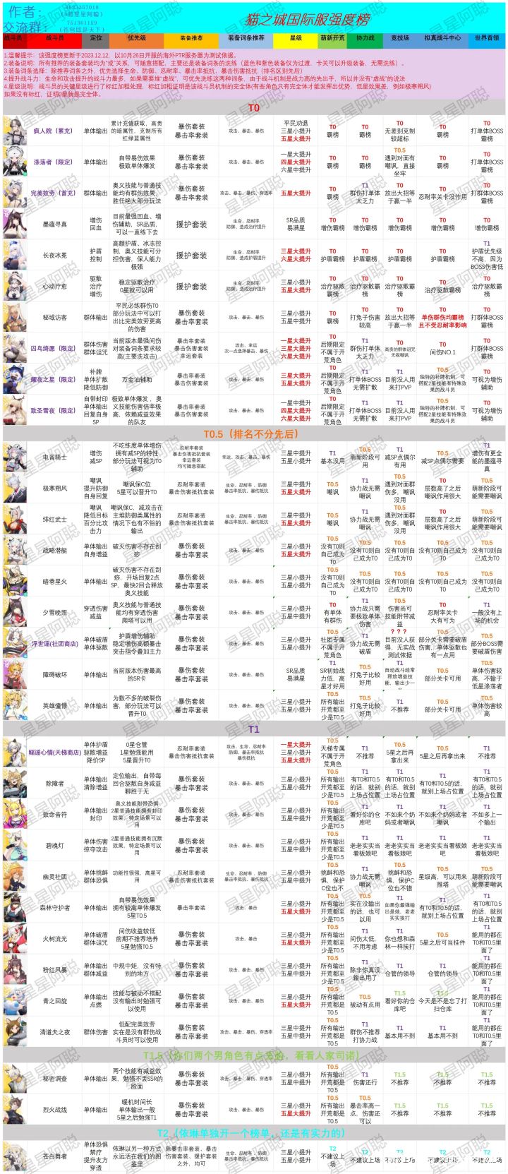 本文为猫之城开服角色强度榜一图流。观前提醒1.该榜单制作均参考终测,如若公测有所改动,会第一时间更新榜单。2.强度排名的主观性很强,不放心的可以货比三家。3.有不同意见欢迎在弹幕和评论区友善讨论。4.扫描榜单下面的二维码可以进入交流群,一起愉快撸猫。梯度说明T0:表示角色强度高、泛用性广,抽到必练。T1:表示要么角色强度一般,要么角色泛用性一般,可选择性培养。T2:表示只在特定场