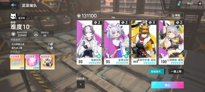 这一关主要靠的是金毛B技能吃火打星(原火量+吞火量的消耗,高优先级),狼B技能(次高优先级),吉他A技能(能打两下,中优先级),其他技能全用来升星给金毛B技能吞 ———— 第一波尽量刷出两个金毛B技能,通过吞火能更快破盾,再配合狼B和吉他A,这是通关思路(——ps:破盾前千万别用sp技能——)最后一波金毛sp起手(额外A技能),狼有的话就第二个出(额外伤害),剩下的两个只要是上面说到的技能都可以,其实也挺简单的