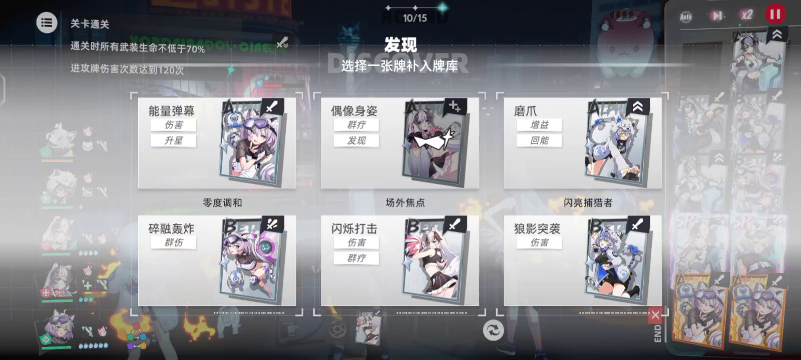 分享下自己的心得,也就猪好打点,其他的我只过了8,没门票了,今天还没去试9,个人感觉,主要就是尽量保证要让注射和主C多放技能,所以需要拿零度B技能来丟牌合牌,饮料随意替带都行,反正肯定没位置放第四个人的技能,基本都是丟第四个人的技能来空位置,丢牌很关键,6回合以后有双控尽量双控,我打十叛逆带的凶猛,注射是命运