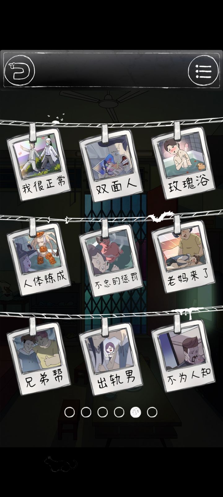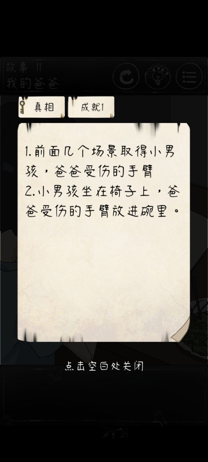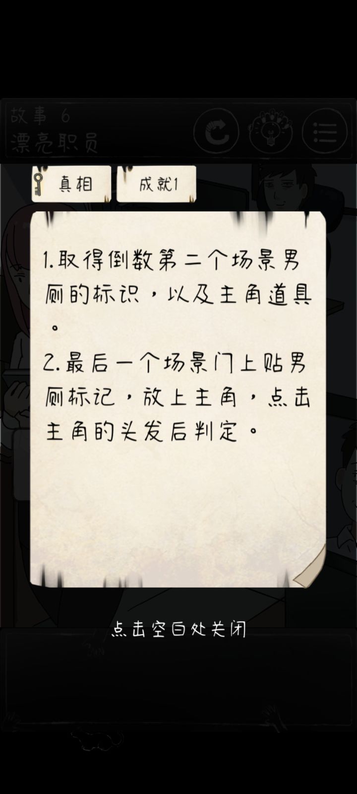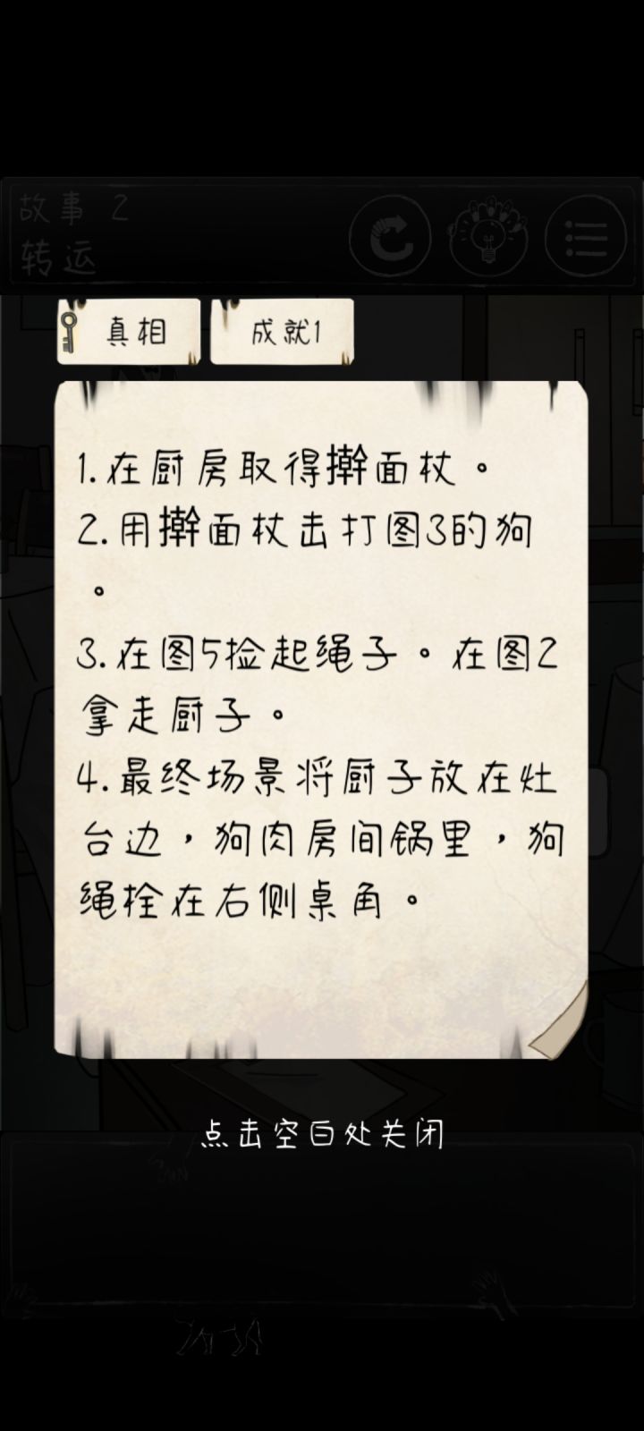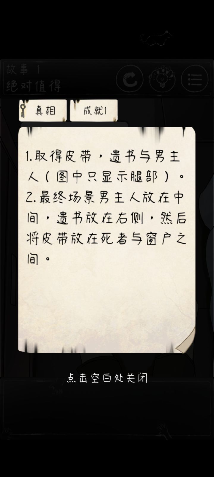 故事1️⃣成就1️⃣:用松紧带替换皮带,剩余操作同上。松紧带在第一个场景左侧的柜子里。故事2️⃣成就1️⃣:操作同上,用服务生替厨子。服务生在第一个场景。故事三🐻罩床底下,黑色🐻罩是外面那个故事四成就1️⃣:场景二柜子下面的格子里取表,放入最终场景中故事五真相:场景一取得铁棍,场景二点击中间的画,画放置在凳子上,选择铁棍再点击少女(哎呀,就是比成就多一个选择铁棍点击少女的步骤)T