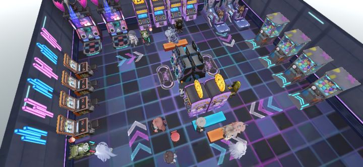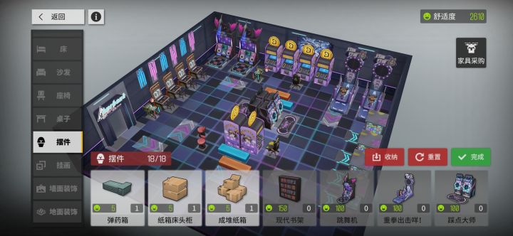 已经成休闲玩家了图为成品,包含本期家具(图上仅有6个灯,一共20个太多了没摆)确实有电玩城的味道了但感觉少了什么