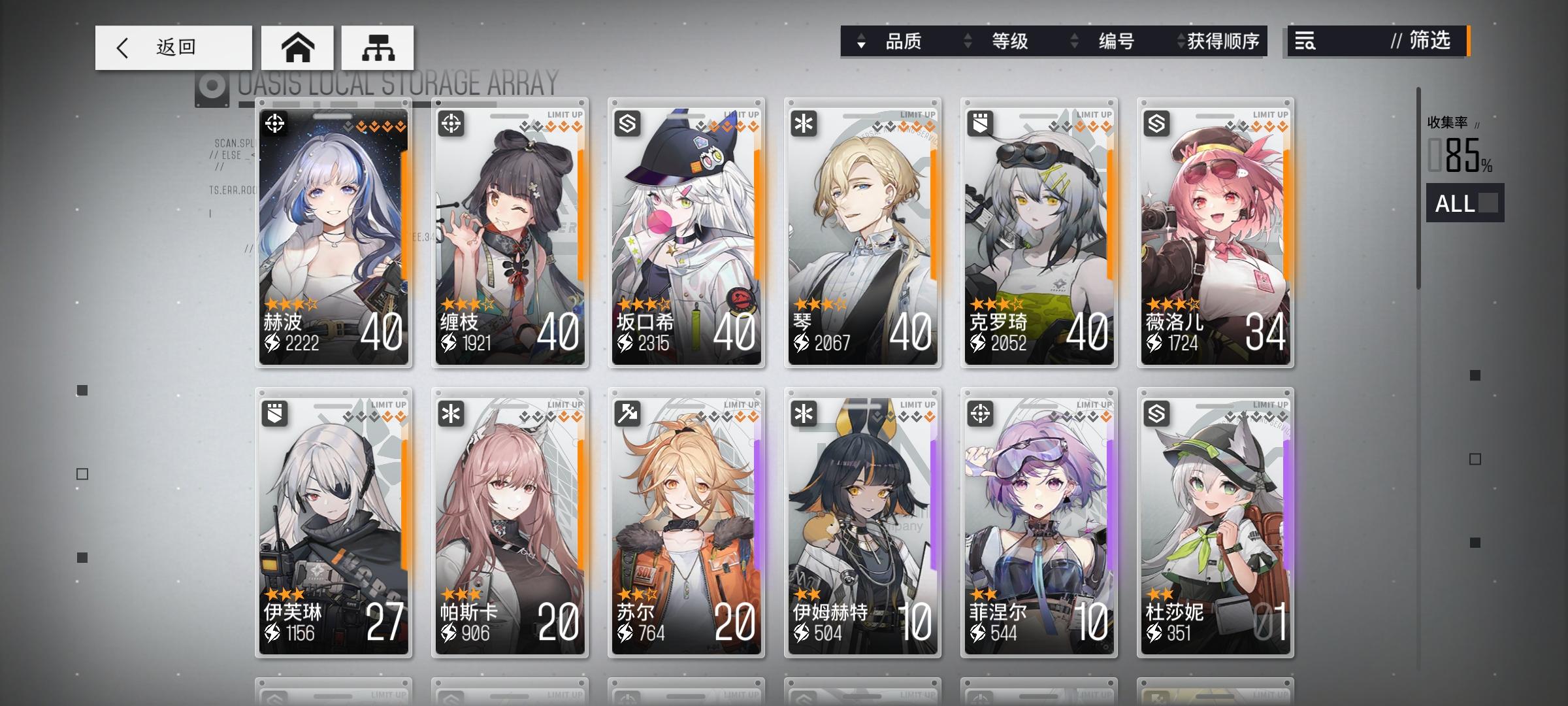 这游戏我一开始是想练特种来着,而且正好最开始抽到的是希和薇,后来想抽七花,结果琴重复了两次,然后又想抽秋,结果池子次次都歪……离散都集了三分之二了,赫倒是抽的挺快,第二次就出了。所以我又犹豫到底是练射手还是特种,然后选来选去干脆都想升级,虽然还是没那么多经验吧,但助战也是个好用处。主要是集卡不集满就不快乐,但往后再抽总是重复就心酸了。缺的不多但也不少,最离谱的是战士死活抽不到,感觉就跟绝缘了似的。😅早知道我应该自选再晚两天选的。