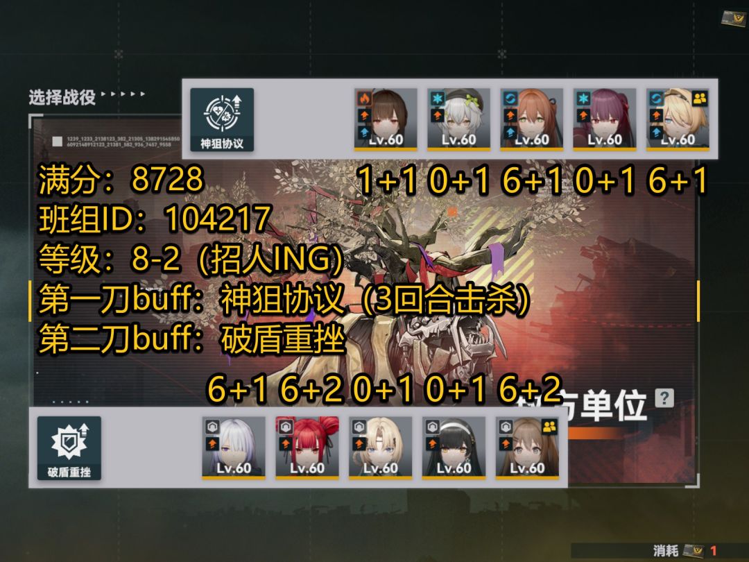 #铸碑者的黎明 #追放二周年 #少女前线2 P1_少前2_尘烟前线_狙击队_8-2班组_国服_20251204 满分:8728 班组ID:104217,等级:8-2(招人ING) buff:神狙协议(班组战前线援助)、九转大肠(活动层烹饪) 阵容:0+1玛奇朵、0+1杜莎妮、1+1罗蕾莱、6+1春田_借班组6+1妮基塔 谢谢大家观看及指教!!! (●'◡'●) ✦视频中操作手法有不完善的地方请见