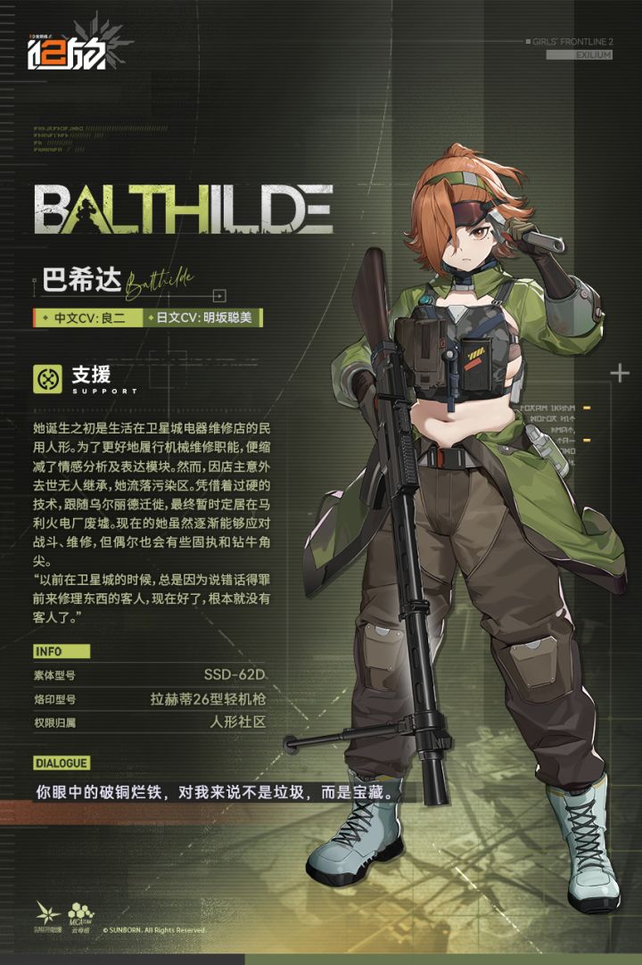尊敬的指挥官,现在为您带来支援人形【巴希达】介绍!她诞生之初是生活在卫星城电器维修店的民用人形。为了更好地履行机械维修职能,便缩减了情感分析及表达模块。然而,因店主意外去世无人继承,她流落污染区。凭借着过硬的技术,跟随乌尔丽德迁徙,最终暂时定居在马利火电厂废墟。现在的她虽然逐渐能够应对战斗、维修,但偶尔也会有些固执和钻牛角尖。“以前在卫星城的时候,总是因为说错话得罪前来修理东西的客人,现在好了