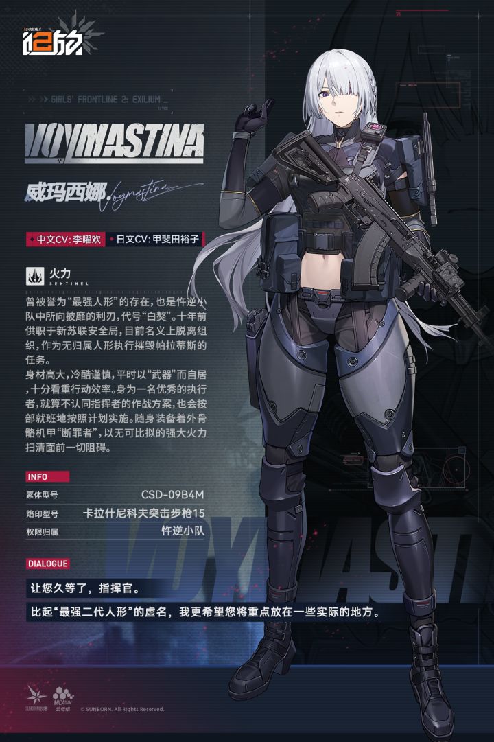 尊敬的指挥官,现在为您带来火力人形【威玛西娜】介绍!曾被誉为“最强人形”的存在,也是忤逆小队中所向披靡的利刃,代号“白獒”。十年前供职于新苏联安全局,目前名义上脱离组织,作为无归属人形执行摧毁帕拉蒂斯的任务。身材高大,冷酷谨慎,平时以“武器”而自居,十分看重行动效率。身为一名优秀的执行者,就算不认同指挥者的作战方案,也会按部就班地按照计划实施。随身装备着外骨骼机甲“断罪者”,以无可比拟的强大火
