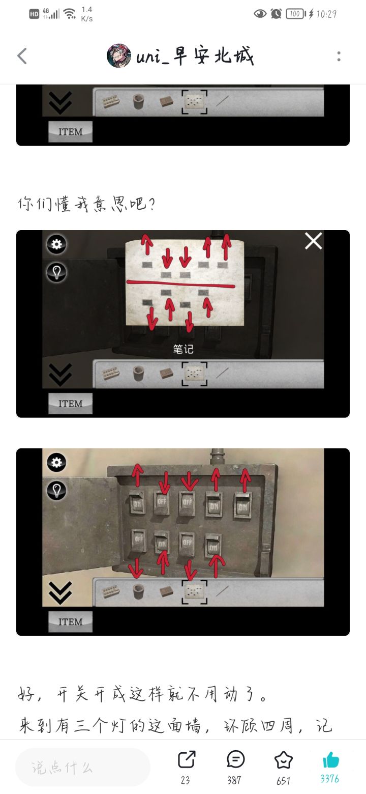 2.开关打开的灯和大门右下角的锁有对应,一楼一共八个灯,电梯上面还有一个,全部一共九个灯和锁对应