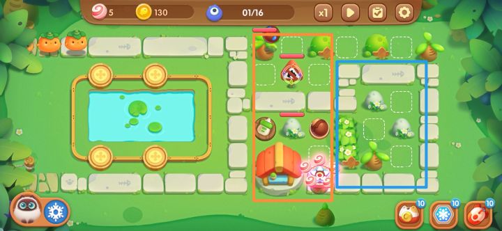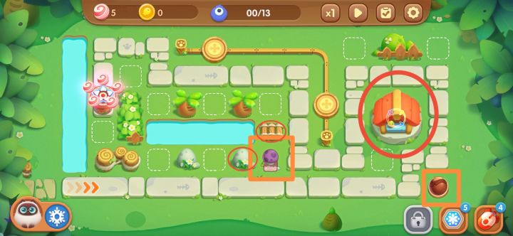 1.开局摆两个火焰,优先升级中间火焰,接着升下面的火焰。第一二波怪不急着打,等抢了水果回城的路上再打(争取时间打障碍物,优先打右边橘子树,因为每隔一段时间就会多两个橘子怪)2.第3、4波怪千万不要开倍速!!!不要打障碍物!!!第3波有几只血量特别高的,看情况使用技能。右边再摆一个火焰,补充攻击3.等第4波打的差不多了以后把橘子树干掉,空位摆俩火焰俩蘑菇,顺便把旁边牌子打了,里面是奶瓶。接着继续