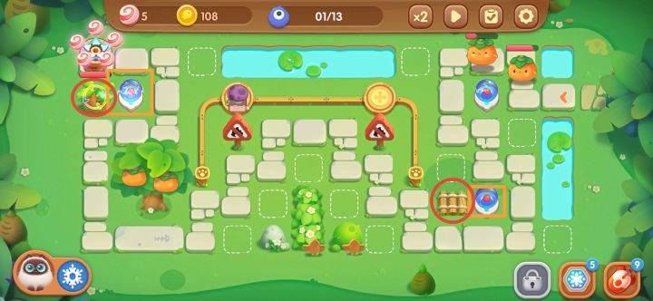 1.开局右下角放炸弹,中间放蘑菇,抽空打红圈圈障碍物(优先打房子,里面有4个火焰塔)炸弹优先升级2.右上角放两个炸弹,继续抽空打障碍物,塔升满级3.房子打掉之后,拆两个火焰,留下两个升满级4.拆掉的两个火焰位置补上蘑菇,升满级,左边放炸弹抽空打障碍物5.轨道上的两个放炸弹,看怪物位置自己拖动。最后一波用一次技能,完成٩(๑❛ᴗ❛๑)۶三星通关