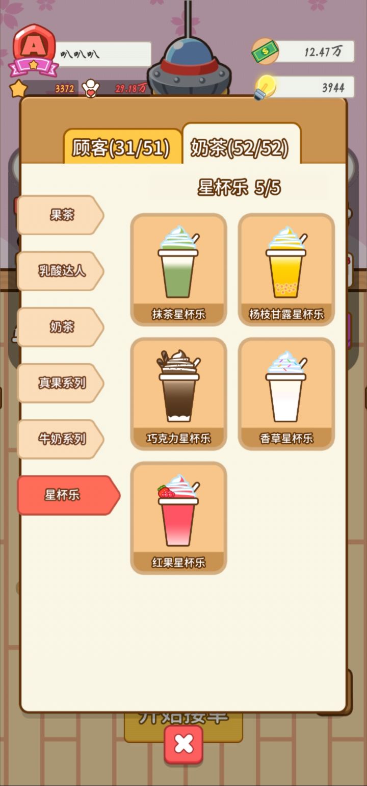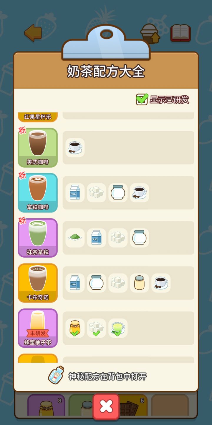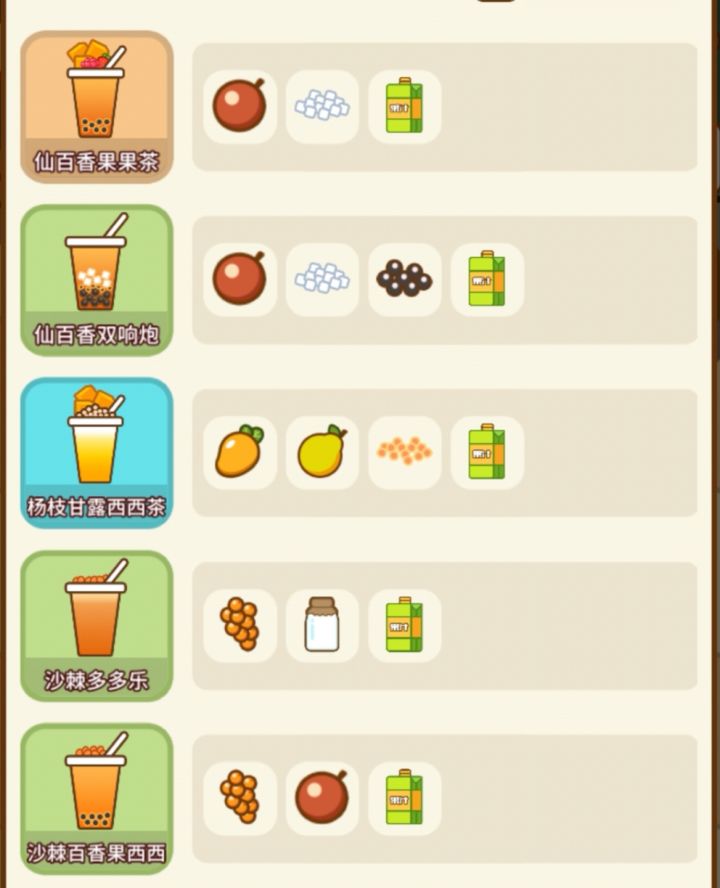 看到不少小伙伴在问配方,我来强答一波😄果茶系列乳酸达人真果系列咖啡家族Tips:1.新版本更新后,制作订单的奶茶价格有所提升(接到过五千到六万不等),大厅服务客人售卖的奶茶价格下跌(我个人的情况是大概从四五千一杯跌到两三千一杯)。2.休闲区家具似乎变便宜了,而大厅价格上涨😅。估计是看大厅的时间更久吧。3.果园紫色品质和金色品质的水果种植时间变长了,大部分材料需要更多灵感才能买了!4