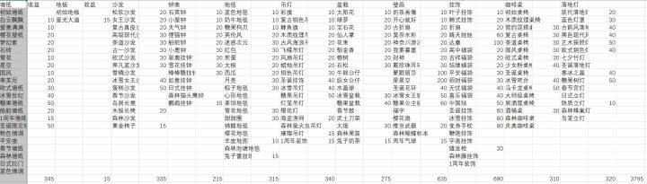 目前已购家具的总增益是3795%,可能有录入错误,但也大差不差了,杨枝甘露恋人的价格是1122,那么VIP的订单的初始价格应该是1122*(37.95+1)*5=218509.5吧,结果只有131106,说明实际收益只有3倍,而不是订单里说的5倍。普通订单里的红果小姐姐是3311^85-1=37.5,燕麦可可3077^79=37.95。以及,我讨厌死这个收集方法了,但凡大颗粒材料,只能2颗2颗发