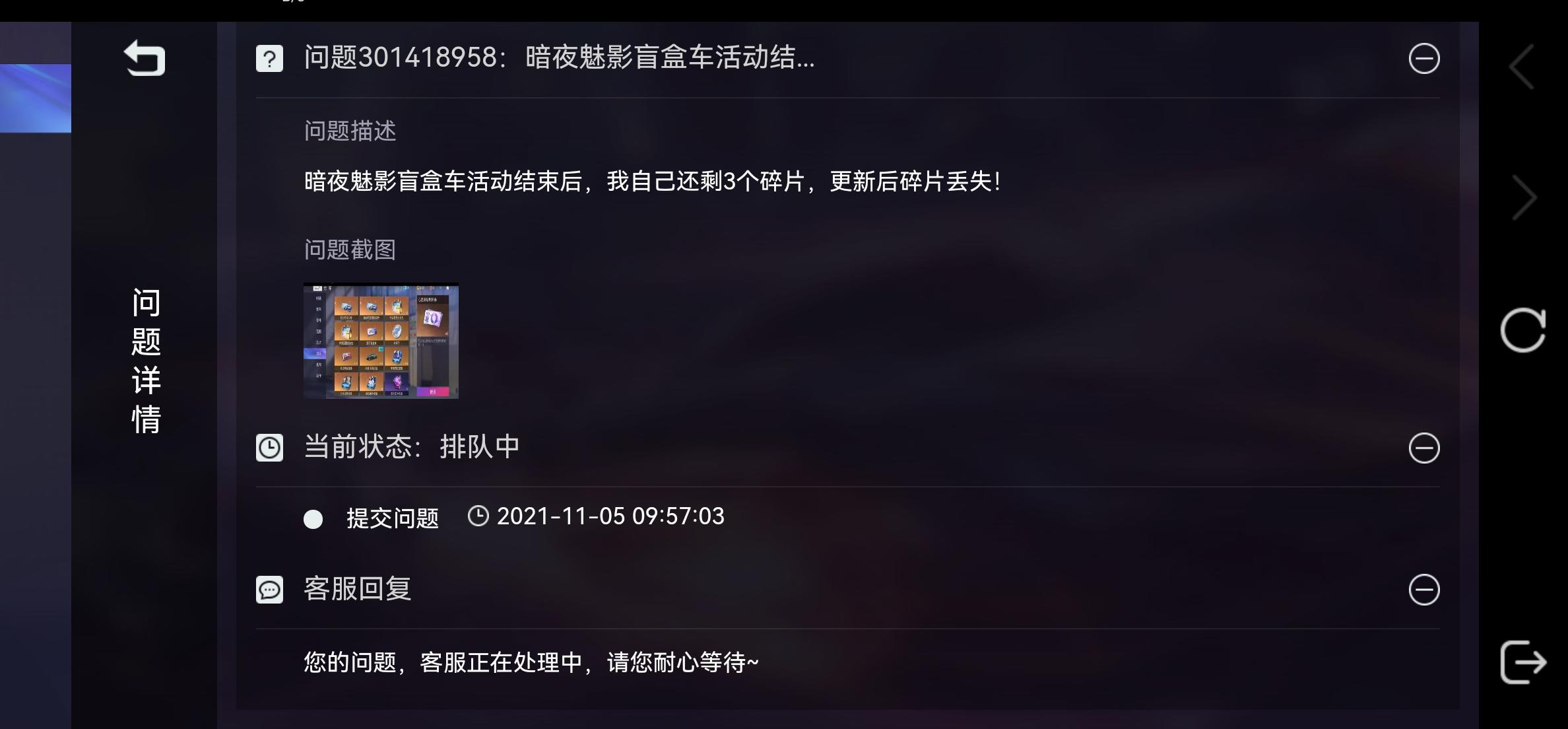 我暗夜魅影没兑换的碎片为什么更新之后会没了?盲盒规则里哪里说明了每期碎片会强制回收?你们项目组这么玩不起吗?后面截图会更新一下处理进度:客服响应挺快的,回复了但没完全回复