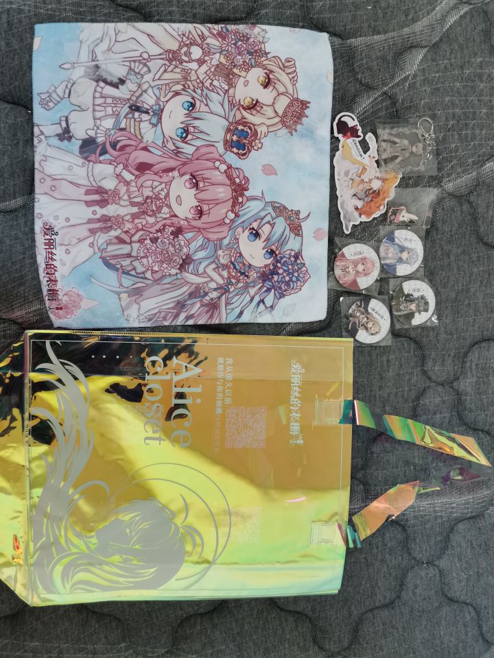 咱就是说这个周边!也太漂亮了吧!!!感谢爱丽丝啊啊啊啊啊!!!ヽ(爱´∀‘爱)ノ单肩包真的好好看啊啊啊啊!拍不出来镭射效果!真的好漂亮!开学就带学校去背!(上面的囡囡好漂亮!虽然我还不知道是谁)小兔子胸针可爱!四个徽章也很可爱!还有一个小毛巾?哈哈哈哈哈是不是小毛巾我都不会用的!因为太可爱了!挂起来欣赏!重点:美美等公测!!!