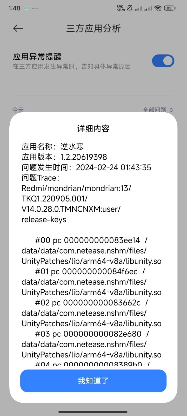 红米K60,进游戏后,画面一卡就闪退,已经好多次了,图是凌晨的,白天玩的时候也还是这样,修复也不行内存是512的,还有两百多G。model: Xiaomi 23013RK75C,检测结果: 无兼容性问题os: Android OS 14 / API-34 (UKQ1.230804.001/V816.0.4.0.UMNCNXM),检测结果: 无兼容性问题gpu: Adreno (