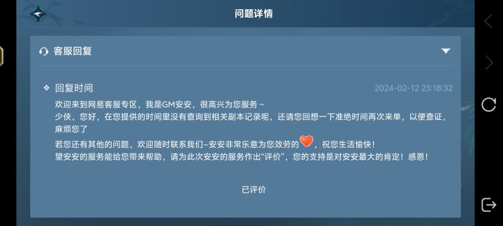 2024年2月10日22点45-55分,打完舞阳城六尊使15次保底罗彩签,爆了白夜拂雪和黄泉砂,白夜拂雪在背包和外观里都找不到。我对象上我号也看不见,然后反馈完bug告诉我查不到副本记录。和我对象聊天记录的时间就在那摆着呢,难道要我精确到几分几秒打本的?以后每次打本出外观难道都要我截个图?万一没到背包里用来反馈问题证明我的清白?转人工客服也是假的。转进去也是ai客服,真烦啊,哪位碰见过这种情况的侠