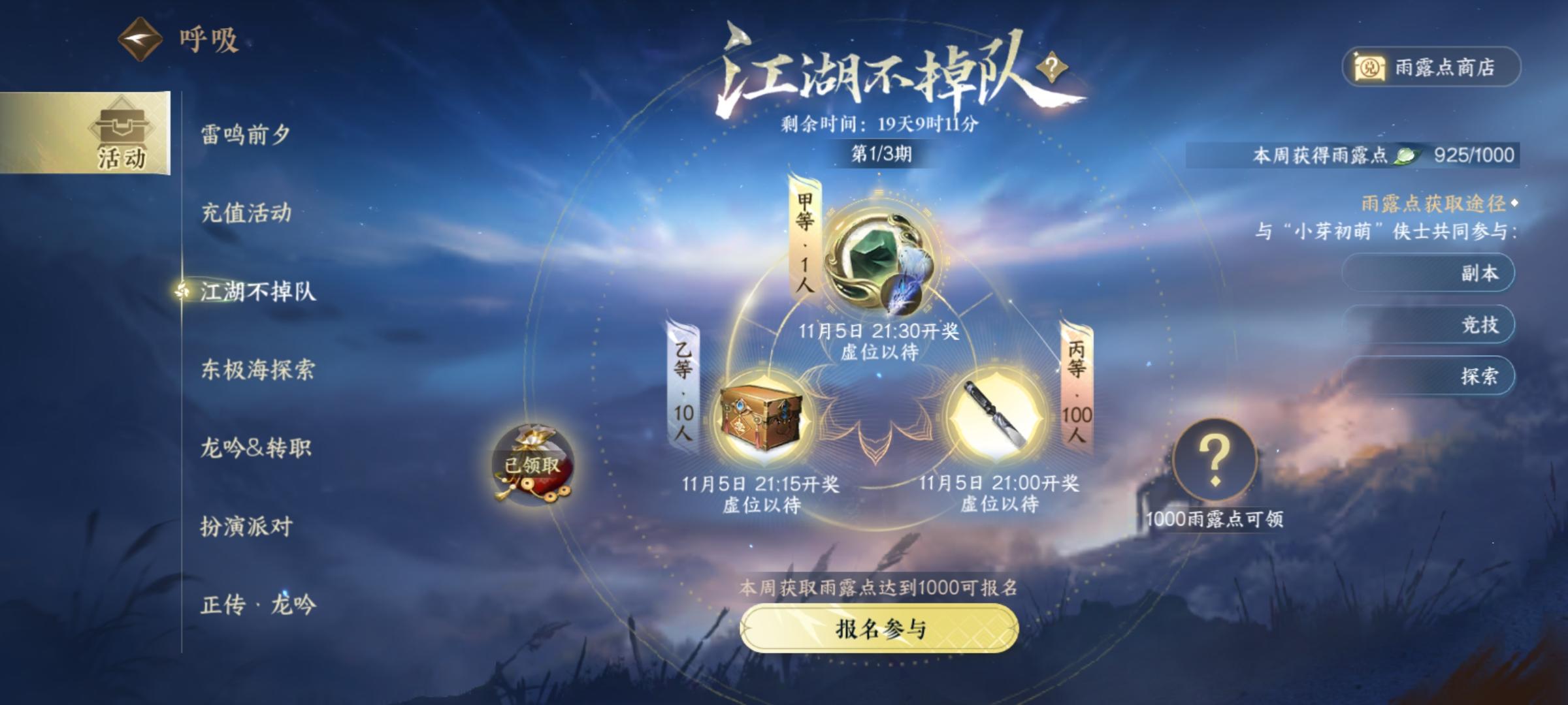 带着小芽刷的雨露点,队友全都满了,只有我和另一个龙吟雨露点卡在900多干刷不涨,舞阳城,33,江湖风雨事都试了,我卡在925,另一个龙吟卡在950,修修吧,这什么鬼👻Bug