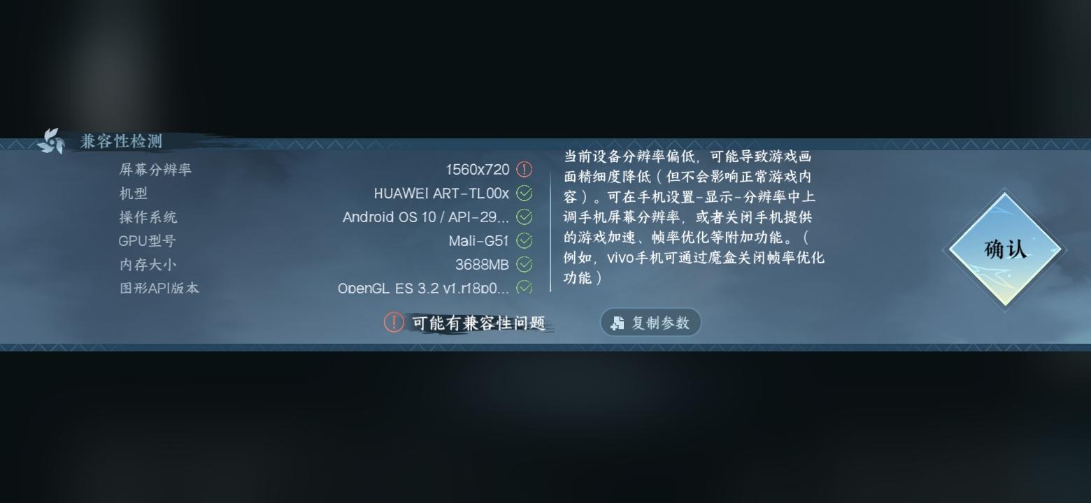 屏幕分辨率: 1560x720,检测结果: 可能有兼容性问题机型: HUAWEI ART-TL00x,检测结果: 无兼容性问题操作系统: Android OS 10 / API-29 (HUAWEIART-TL00x/102.0.0.275C01),检测结果: 无兼容性问题GPU型号: Mali-G51,检测结果: 无兼容性问题内存大小: 3688MB,检测结果: 无兼容性问题图形API