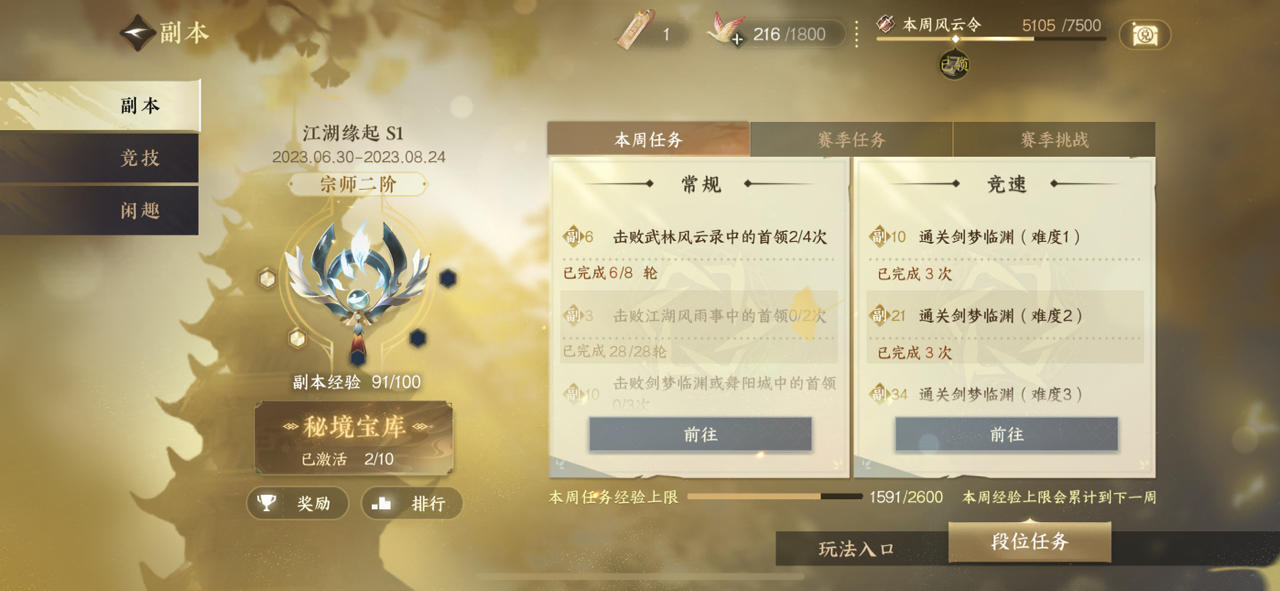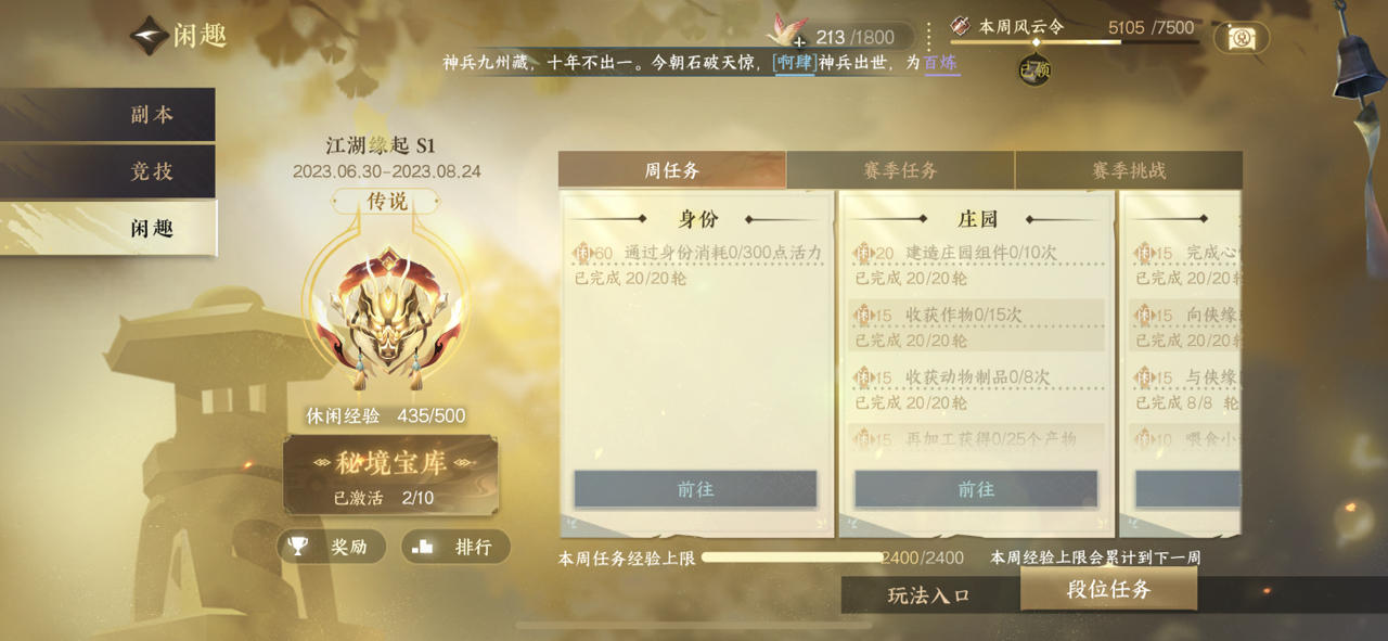 新的一周闲趣和副本的段位任务都没重置,还是上周的进度,赶紧修复,把我这周做完的点数加上