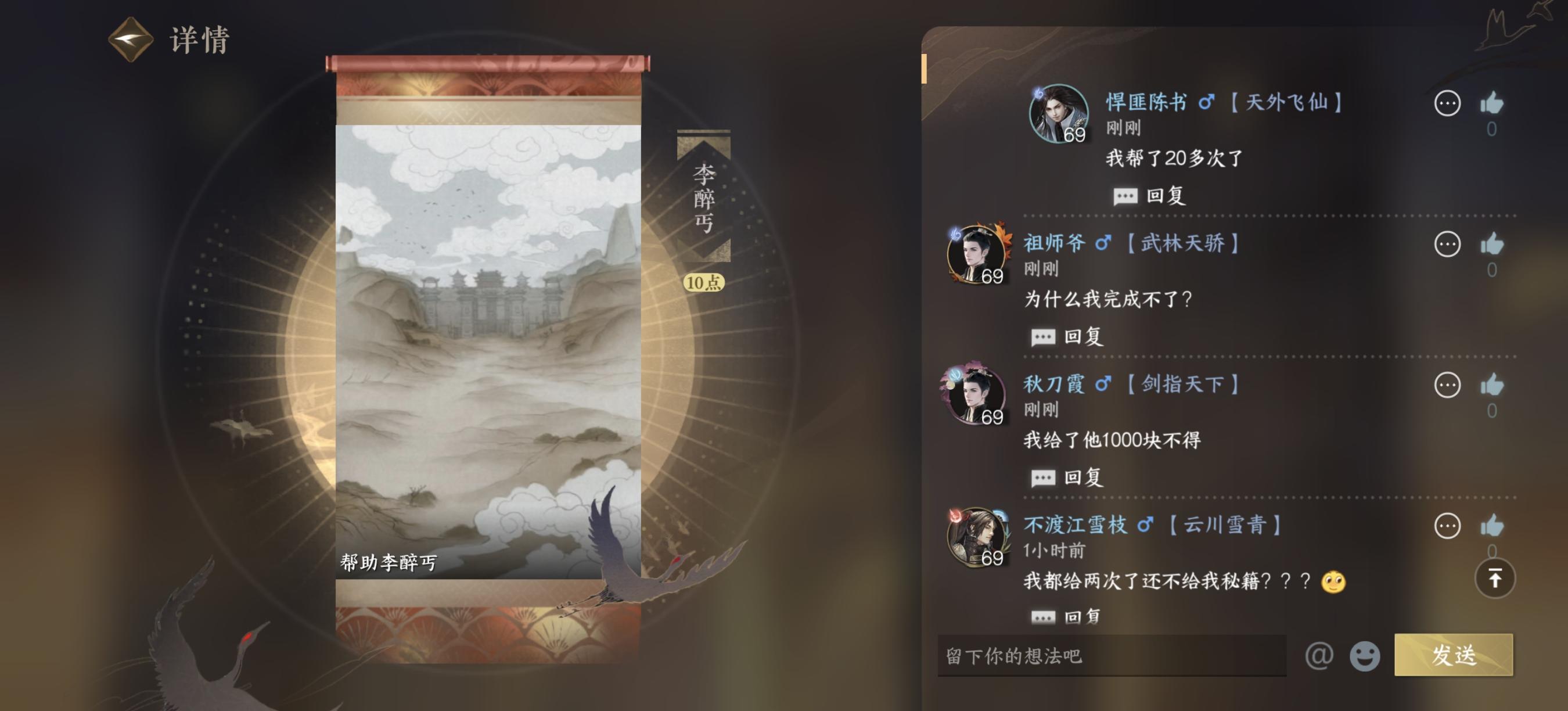 给李醉丐送了几十次东西了无法触发成就,拿不到技能。结果点开这个成就评论一看,最新的评论全是说成就完成不了。麻烦官方尽快解决!!!