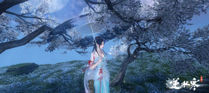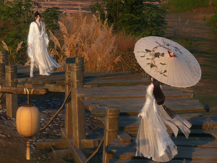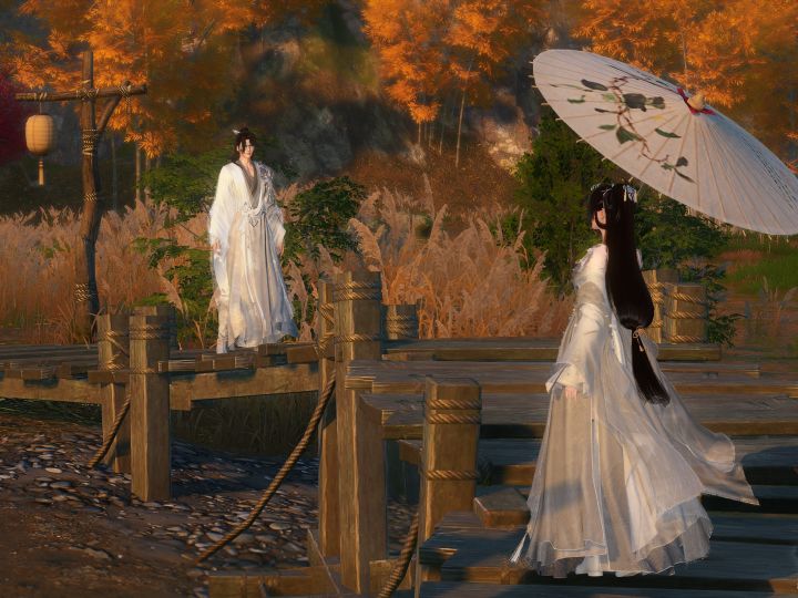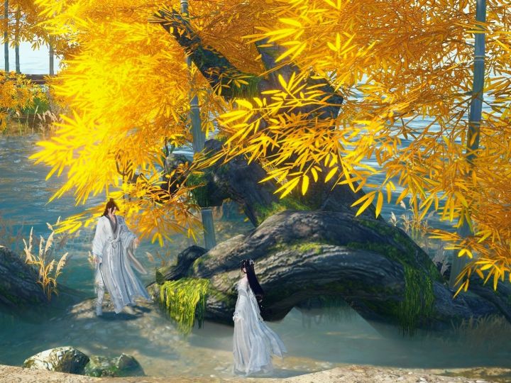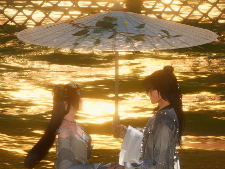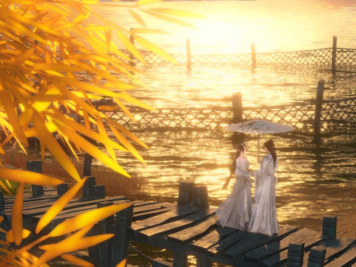 金风细碎,叶坠香砌。山中无事,共驻飞泉。竹枝斜水,落泉有声。《秋思》,随涧泻音。斜阳晚照,烟波拍岸,群山绵延处,曲水绕松梁。浮波粼粼,点点跃金,旋伞斜举,见君,我心欢喜。#逆水寒手游