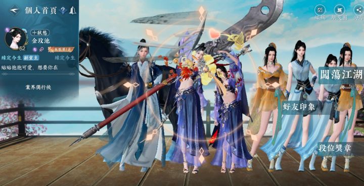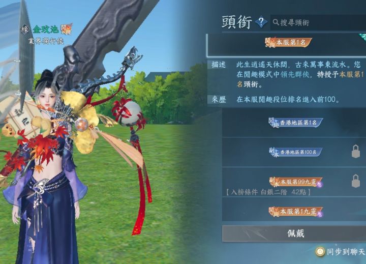 台服开服第3天,拿到闲趣全服第一,春秋掩月巨型大刀,还在主页卡出2个郁芊芊,她们CP名可以叫郁郁了。