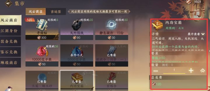 大家好~今天给大家说一下目前可以获得金色内功心法的途径,看看有哪些你还没拿到!1.风云商店每周可兑换4个随机金色心法!2.盈玉商店!每周可兑换3个随机金色心法,需要24个盈玉印!3.副本!每日副本也会出,但是几率很小,至少在我这很小,就不多说啦!周本:【剑梦临渊难度二】击败领主有3次获得金色内功的机会,通关必得1个金色内功心法!公共出的交易心法,需要用铜币竞拍,需要的准备好铜币!【