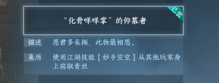在副本里对化骨咩咩掌使用妙手空空可以偷到一缕青丝,使用后可以得到一个称号:化骨咩咩掌的仰慕者
