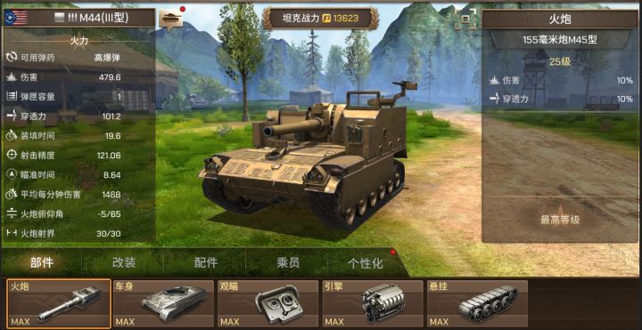 美国制造,50年代初期研制定型的装甲自行火炮,1953年装备部队。本炮系由M-45式身管结合M-41轻型坦克底盘而成。装备装甲师、机械化步兵师炮兵团。每团1营炮18门。已退役。是50-60年代美国及北约其他国家主要装甲火炮。1956年改进为M-44A1。类型:火炮级别:Ⅲ级获取方式:45级解锁价格:1200000金币三改满级属性