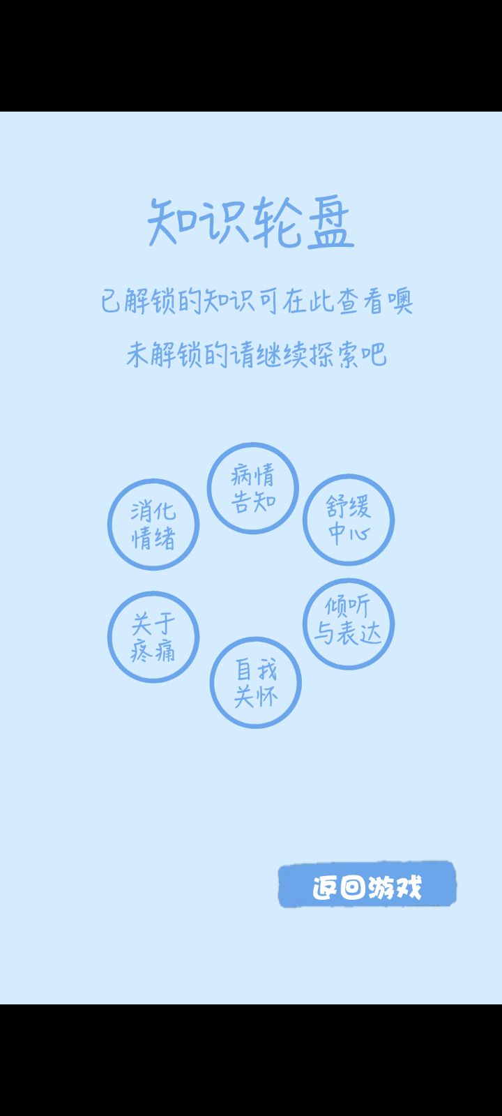 作为一个科普游戏不错,里面的tips真的很有用。只是主角身份不清,让人有点不能太带入,癌症的治疗过程很漫长也很费钱,化疗放疗各种药,几乎会压垮一个不富裕的家庭。但不论是母亲还是主人公都好像不是很在意这点,压力看上去也有点浮于表面,代入感不强。可能是太短的原因吧,如果要上线的话,可以适当说明主角身份,再增加一下关于工作的part,更生活化。