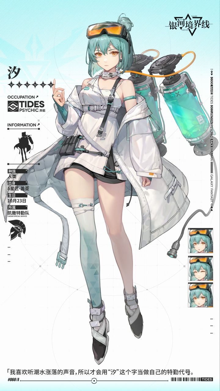 代号:汐种族:人类所属:凯撒特勤队“我喜欢听潮水涨落的声音,所以才会用‘汐’这个字当做自己的特勤代号。”——————汐,早年因出色的异能天赋而进入异能特工的培训机构接受训练。异构虫战争爆发后,被编入异能者部队「青鸟特战队」,被派往前线进行特种作战,后凭借战功而获得提拔,被调入了特勤队。但因为泄露情报部机密,让恐怖组织「荆棘」的内线成功逃跑,由此遭到拘禁。但之后在追踪「荆棘」的行动中,她戴