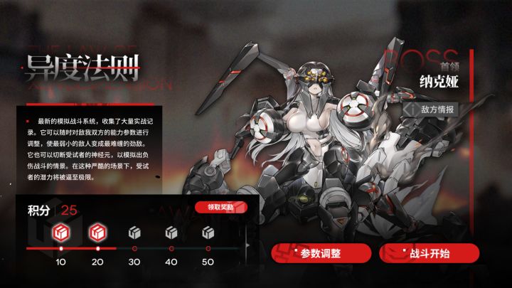 最新的模拟战斗系统,收集了大量实战记录。它可以随时对敌我双方的能力参数进行调整,使最弱小的敌人变成最难缠的劲敌。它也可以切断受试者的神经元,以模拟出负伤战斗的情景。在这种严酷的场景下,受试者的潜力将被逼至极限。 ▼开启时间2月14日 10:00 - 2月21日 5:00▼玩法说明1.在「异度法则」玩法中,指挥官可以通过调整敌人的参数,提高作战难度,以此激发特勤的潜力。2.每个参数有一定的