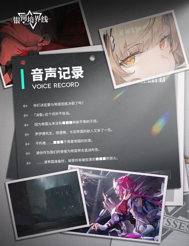 指挥官,后勤部准备的兑换码补给已送达。一分钟前,情报部的闪点小姐同步了一份音声记录,请您查阅。————————————你们决定要与帝国彻底决裂了吗?「决裂」这个词并不恰当。因为帝国从来没有■■■种族平等的子民。罗伊德先生,很遗憾,今后帝国的敌人又多了一位。不朽者……■■■不再是帝国的奴隶。请你作为我们的使者为帝国带去宣战布告。……请帝国准备好,接受所有被奴隶的■■■的怒火。——