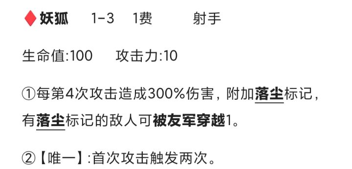 劫匪 射手2费 1-4距离 3.5拍 28(10)攻击 228(80)血量1.打劫:对同一个目标造成4次伤害时,降低并获得目标当前30%(向下取整)攻击持续2秒,下一次攻击额外扔出炸弹造成2格目标当前30%攻击伤害
