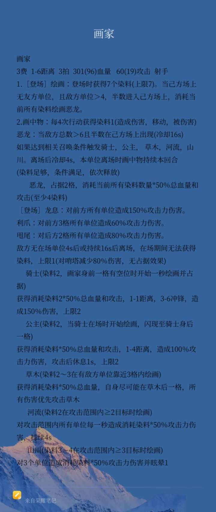 雕刻家3费 1-1距离 5节拍 690(220)血量 141(45)攻击 战士1. 雕刻:对前方1-7距离内最近的目标进行雕刻(标记),在本单位面前出现石头,每1s进度25%,雕刻完成交换位置,雕刻家对面前的目标造成200%攻击力伤害并眩晕1s。雕像可被控制打断,被打断对1-7格内最近单位造成(100%攻击+雕像进度*攻击力)伤害书法家2费 1-6距离 4拍 220(70)血量 40(13