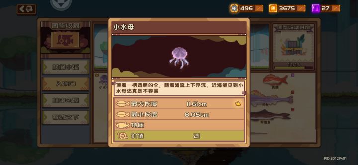 为了搞全图鉴,挂机钓鱼钓了3小时,不过给的奖励还不错,而且1000鱼币=1核心。如果刷鱼币建议用氪金(✘)白嫖紫币(✔)鱼钩和鱼竿,这样钓鱼平均水平很高,基本不会有垃圾。还有第一个鱼塘全图鉴很重要,因为有个小鱼钓竿,尺寸很短,可以专门用来钓一些小鱼。在第二个图的水母我目前没有钓过12厘米以上的,正常的鱼竿最低都是12厘米,所以没有搞到迷你竿,后面图鉴很难全开