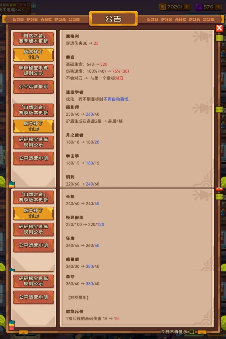 英格列t1.5↘t3:它似了, 震撼无敌了。★磐岩: t1↘t1.5, 不能无脑放≠有脑。迷途学者:t4。待定摄影师t5: ? 不如改成身后10格。月史t3:若之调整,技能伤害不一起调?拳击手t5: 小唐人, 很多上位替代。铜刺t3: 凑调整数能多发钱?“长枪”t5:史, 自家角色都记不住名字。假面t5: bro觉得+20攻击力能天神下凡。能量盾t5: bro觉得+20生命值能天
