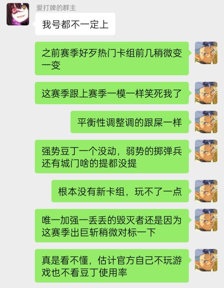 这赛季很离谱,热门卡组几乎一点变化都没有,上赛季强势豆丁一个没削,弱势豆丁一个没增强,还出了几个飞舞新卡。想说的话上面都提现了,最后补充一下。刃旋技能都秒不了60血射手了,官方还不调一下升级四舍五入问题吗