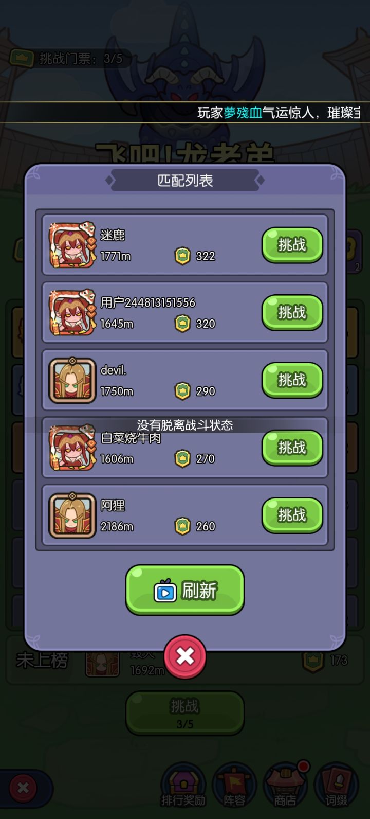 飞吧,龙老弟活动今天就只能打一次,之后再打就进不去,再点就显示没脱离战斗,消耗了挑战次数却没挑战结果。