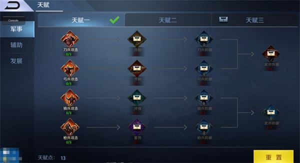 《止戈》中,主公每升一级即可获得一点天赋点,这些天赋点如果分配得当可以帮助主公更加高效地获取资源以及在对战中立于不败之地。游戏中天赋系统分为3个大方向:军事、辅助和发展。若主公晓勇善战,十分享受战斗的过程,则天赋点的分配可侧重军事方向;若主公内敛沉静,不喜斗争,则天赋点的分配可侧重于发展和辅助方向。 游戏内可建立三套天赋方案,主公可以花费少量金币进行切换,外出征战时使用军事天赋,打完仗回到主城