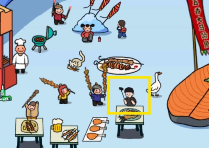 1.广告同个底色消消乐2.水饺3.四大天王/信鸽4.冰佛黑/黄大仙红/雪人套装黄5.二哈6.动物红/冰泳老人黄/拉雪橇的狗夫黑/二人转蓝,冰泳老人被点到了所以看不见7.滑雪男孩8.撸串的人9.短视频男孩