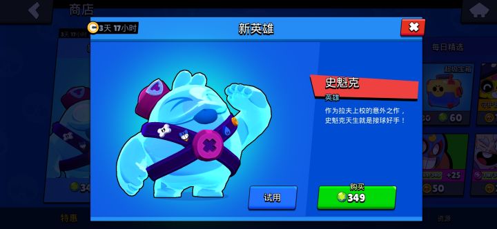 “荒野乱斗”的策划没ma,凡是新英雄就强悍到无敌。这新英雄,不用满级星辉,任何模式都可以恶心死你。史魁克的普通攻击是泡泡,只要锁定目标后就必中且是范围伤害,(英雄1级)攻击伤害值为1000。普通攻击的充能特别快,只要范围伤害可观,一会儿就可以释放出技能。它的技能攻击是抛投小泡泡,分裂出次多段攻击,伤害值还那么高,最高攻击伤害值2000。