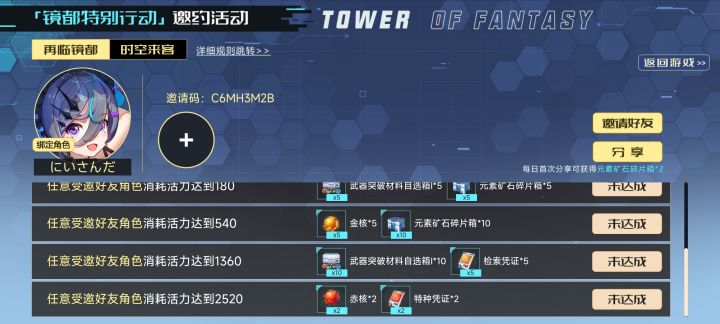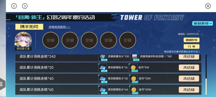 VPJ9V95K 回溯服邀请码 队伍两个40了 但是苦于之前忘记开队伍 一个金核都没算上()不过活动结束前肯定能拿满 来几个萌新一起玩!
