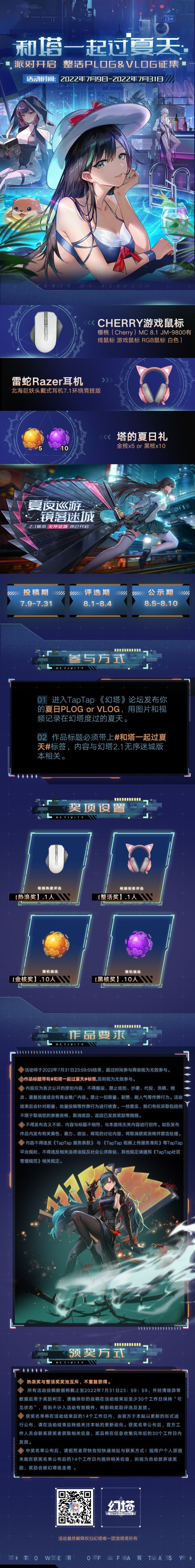 拓荒者,2.1无序迷城版本现已开启。派对音乐响起啦,还不速速进入游戏体验全新夏日冒险内容!这个夏天,和塔一起过吧~(*`∀´*)ノPLOG&VLOG征集即刻开启~٩(๑>◡<๑)۶分享你的幻塔未来派对,赢取CHERRY鼠标、雷蛇耳机、游戏礼包码等奖励!分享《幻塔》游戏内2.1无序迷城相关内容,如线下赛博重庆大屏打卡、参与热浪与集会的截图、凛夜大小姐的镜都街拍、体验2.1主线剧情的精彩瞬间、或是